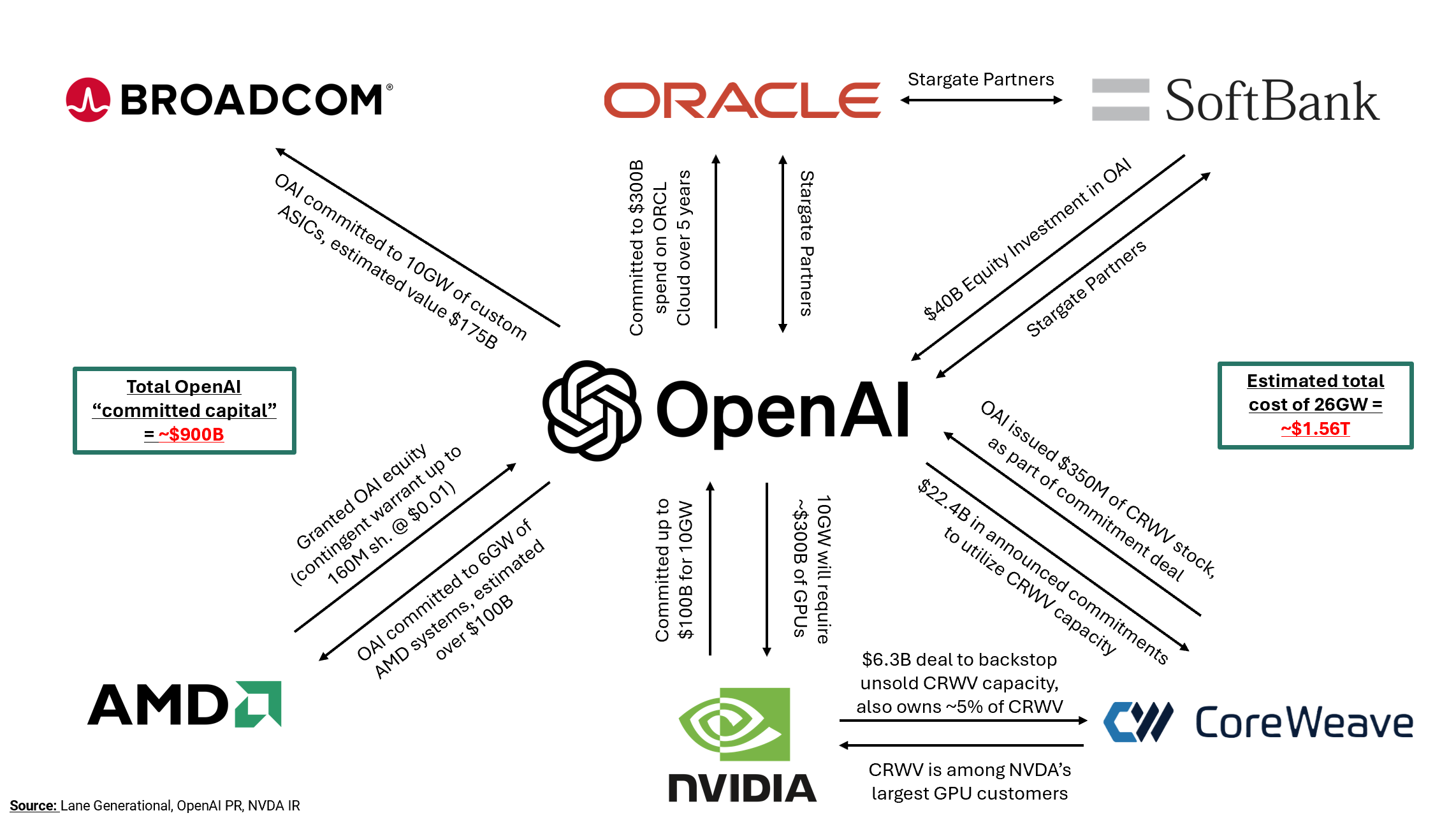 For Altman, it’s go big or go home, as he doesn’t have the same resources as today’s multi-trillion-dollar tech giants. We believe he is capitalizing on his moment in the spotlight to make an all or nothing bet on leapfrogging the competition. Altman’s evangelism for superintelligence has indoctrinated not just Silicon Valley but many prominent tech CEOs, investors, and even global sovereign leaders. Ironically, he was among the first to call AI a bubble back in August before going on to blow it even bigger – we hope Michael Lewis catches that detail for The Big Short 2.0. In the last month, OpenAI has announced a series of prolific and peculiar transactions totaling 26GW of capacity. As you can see below, many of these “partnerships” appear to be circular in nature. These announcements equate to an estimated $1.5 trillion in commitments, which, for a loss-making company with $13 billion in revenue, is pure fantasy to put it mildly.