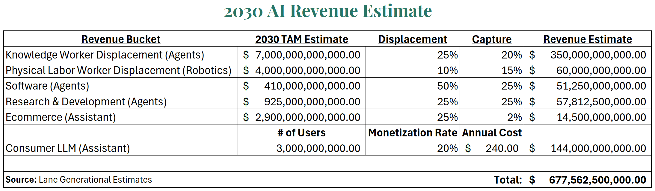 For Illustrative Purposes OnlyWhile it’s nearly impossible to approximate AI revenue potential, as much depends on the technology’s ability to further improve, which would allow it to ascend the corporate ladder from an assistive tool to a full-fledged entry-level role, to a mid-level manager. We estimate six core revenue buckets: 1) knowledge worker labor displacement (AI agents), 2) physical labor displacement (robotics), 3) software displacement, 4) R&D displacement, 5) e-commerce take rate, and 6) consumer-facing LLM. We arrive at a total estimate of $677 billion in revenue in 2030 (roughly in line with our breakeven estimate), with some aggressive assumptions, but limit our estimates (except consumer LLM) to the U.S. market. Most assuredly, our estimates are incorrect and are certainly missing new revenue buckets to come. Yet, the objective of the exercise is to show that just breaking even is a very high hurdle. Our assumptions imply almost 30M American jobs displaced, half of the software industry that’s taken 25 years to build, displaced in less than 10 years, a quarter of the entire U.S. R&D market, 1 in 4 online purchases taking place through an LLM, and 3 billion people using an LLM worldwide with 600 million paying for premium access – all rather optimistic we feel and arguably double counting.