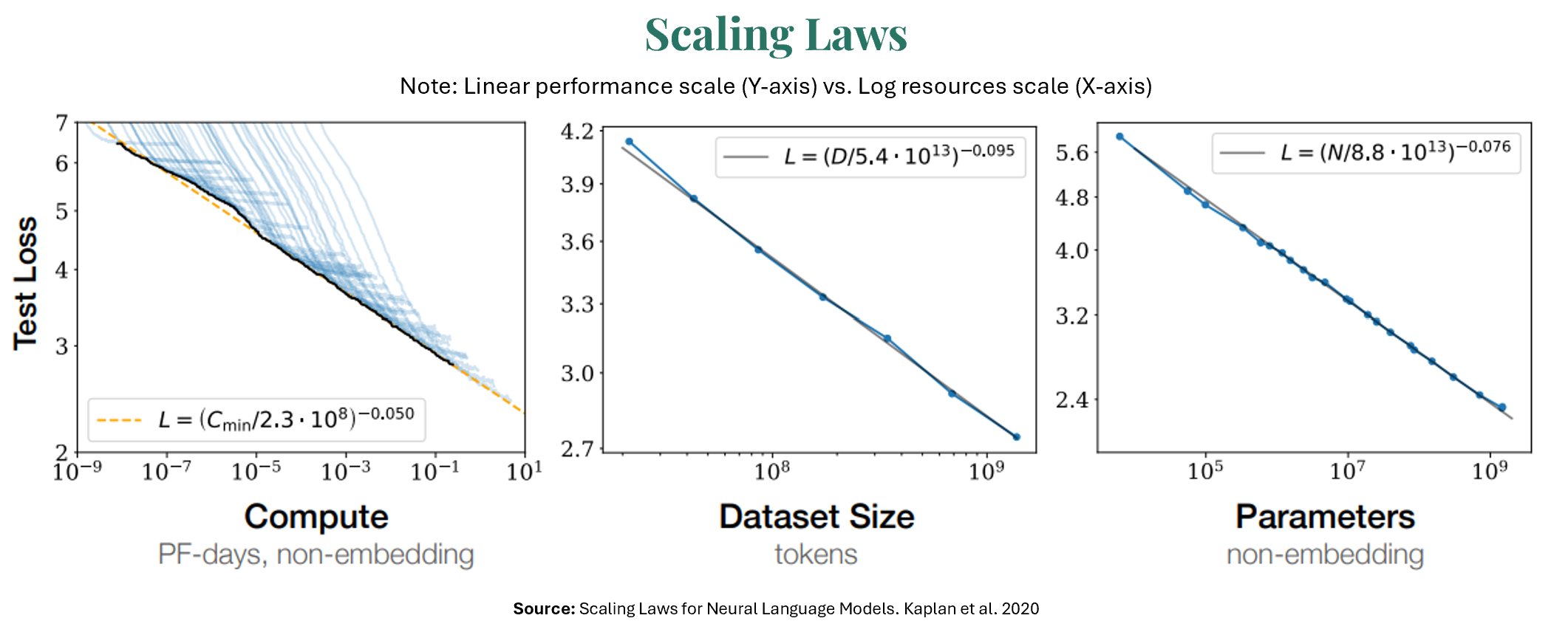 The single greatest driver of AI capital spending is the belief that scaling laws will continue to hold. Scaling laws describe a power-law relationship between an AI model’s performance and its inputs (number of parameters, amount of training data, and the computational resources used to train it). In other words, the power law states that linear improvements in performance are achieved through exponential increases in computing power. Read that sentence again, because it describes diminishing performance returns for exponential increases in resources.