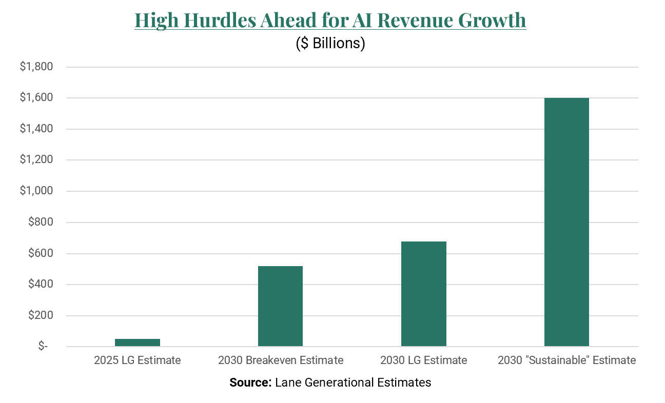 Now, to the trillion-dollar question – what’s required to make a return on AI capital investment? We use the announced 26 GW from OpenAI (estimated total cost of $1.56 trillion from 2026-2030) as well as hyperscaler CapEx estimates to arrive at roughly $730 billion of investment in 2026 (up from ~$400 billion in 2025) and set to grow further in 2027 and beyond. We assume that each dollar of CapEx carries 15 cents of depreciation per year (50% spent on chips depreciating over five years, and 50% spent on the rest of the data center depreciating over ten years), 5 cents of operating cost per year, and 10 cents of cost of capital (10% per year). Thus, each $1 invested requires $1.30 over five years to break even. Conservatively using $730B as the average annual spend for the buildout (2026-2030), that would mean to break even AI revenues would need to be $4.7 trillion by 2035 cumulatively. If we use Bain’s estimate of 4x for a “sustainable” revenue to CapEx ratio, rather than just bare minimum payback with zero profit, the cumulative number jumps to $14.6 trillion. If we assume revenues are distributed evenly over the 2027-2035 period, we get $520 billion of annual revenue for breakeven and $1.6 trillion using Bain’s sustainable breakeven ratio.