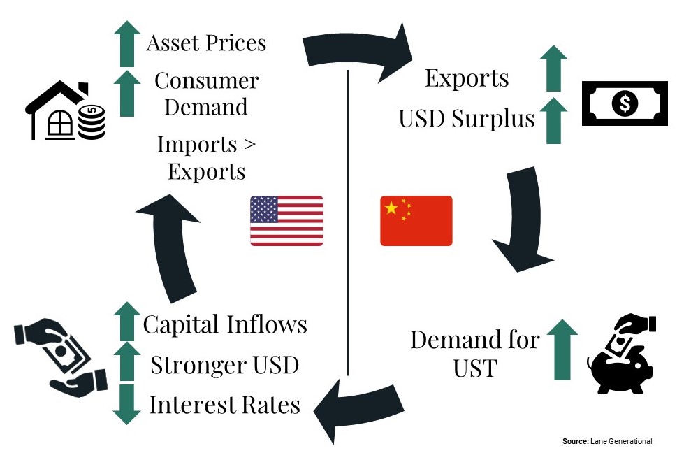For several years now, we have been commenting on the ongoing cold war and believe now is the time for critical updates following many developments in 2025. Stepping back, we must first set the stage. Following China’s admission to the World Trade Organization in 2001, the United States (and Western allies) began the decades long exportation of its manufacturing base to China. Enjoying the fruits of global reserve currency status, the U.S. consistently prioritized the financial economy at the expense of the real, industrial economy. Thus ensued the era of globalization – the increasingly efficient transformation of capital into goods. For most of the 21st century, Western consumers have enjoyed disinflationary access to material goods produced in the East. The U.S. ran persistent, large trade deficits, sending dollars abroad, which came back to the U.S. through the capital account into dollar assets (Treasuries, equities, real estate). Buoyed asset prices, low interest rates, and cheap access to material goods – what more could you ask for?